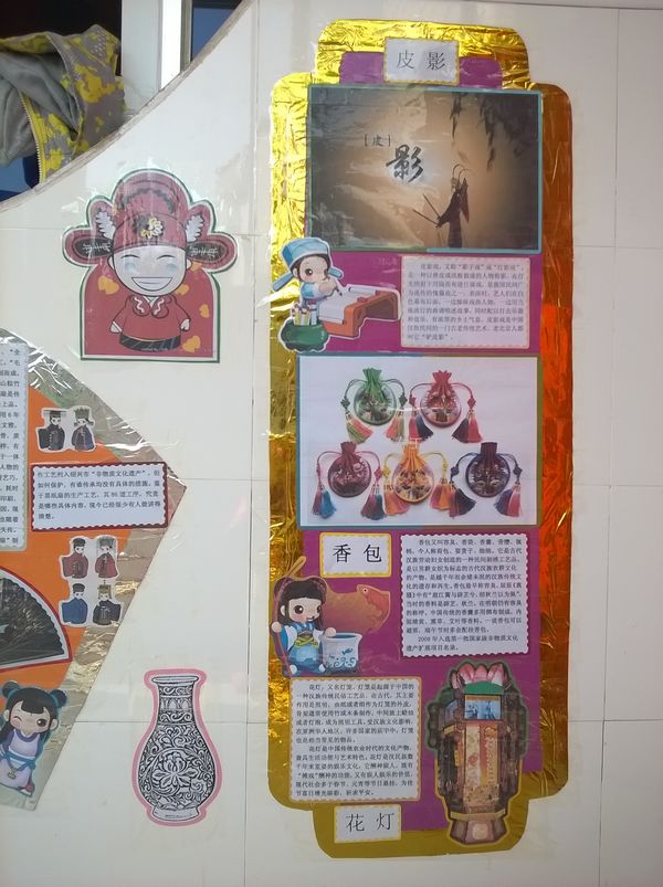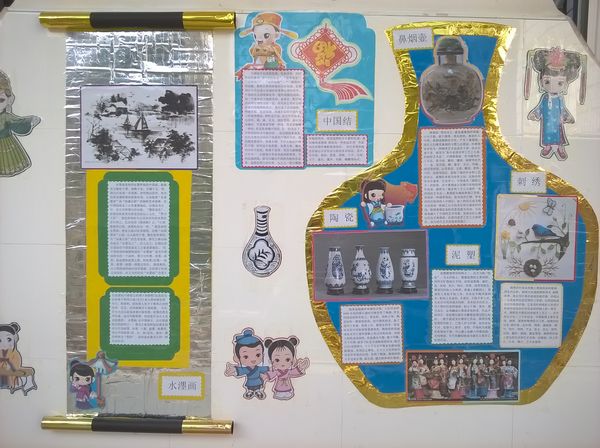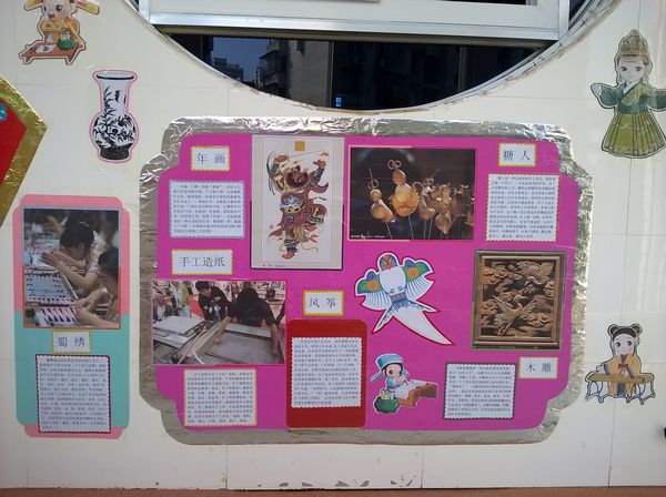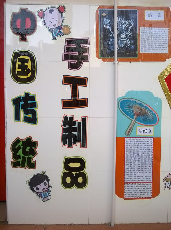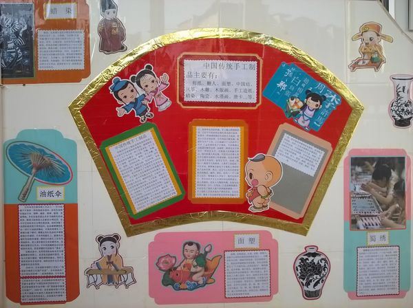 中国传统手工制品是指民间的劳动人民为适应生活需要和审美要求、就地取材,以手工生产为主的一种工艺美术品。由于各地区、各民族的社会历史、风俗习尚、地理环境、审美观点的不同,各地的手工艺品具有不同的风格特色,充分的展示了中国手工艺术的风采。手工制作工艺在我国民间有着悠久的制作历史,是中华民族文化艺术的瑰宝,它以其悠久的历史、精湛的技艺、丰富的门类、传世佳作蜚声海内外。几千年来,传统手工艺产品始终是代表中华民族的一大特色产业。而最具中国特色应是 风筝、剪纸、兔儿爷…………等。本学期,我们中三班以“中国传统手工制品”为主题,进行了班级外走廊墙面创设。下面,请大家一起来看看吧!
